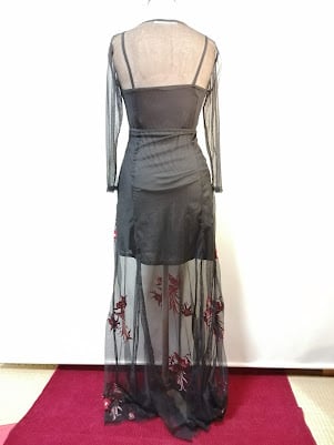 透け感のある素材に美しい刺繍が施されたゴージャスなドレス。パーティーやウェディングなどの特別なシーンに最適。